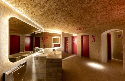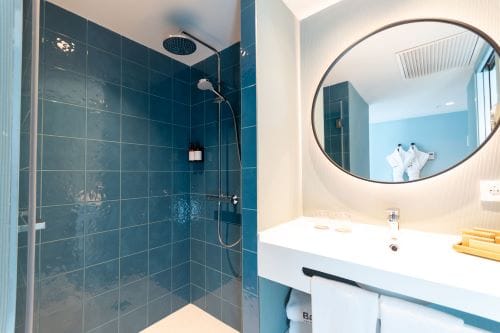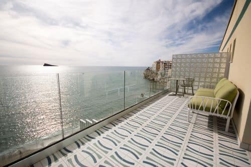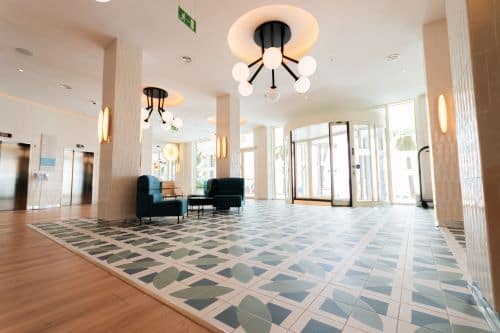 VIVES cerámica ha sido la elegida para producir las piezas porcelánicas de 20x20cm del interior de los espacios comunes como salones, baños y terrazas. Además de las de 30x30cm. antideslizantes de las terrazas de exterior. Así como en las habitaciones el pavimento porcelánico estampado y el revestimiento pasta blanca de los baños, esmaltado de un intenso color mar; los dos en 20x20cm