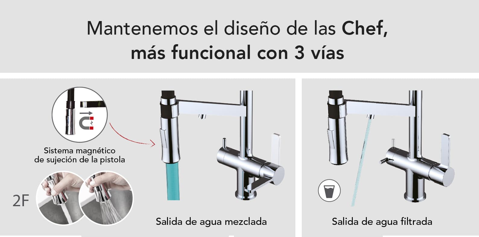 - El grifo de cocina Chef WT19 incorpora en su diseño los sistemas más avanzados de Grifería Clever. Además de su elevada funcionalidad y las prestaciones que ofrece, ha sido pensado también para reducir el consumo de agua.