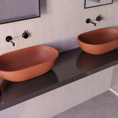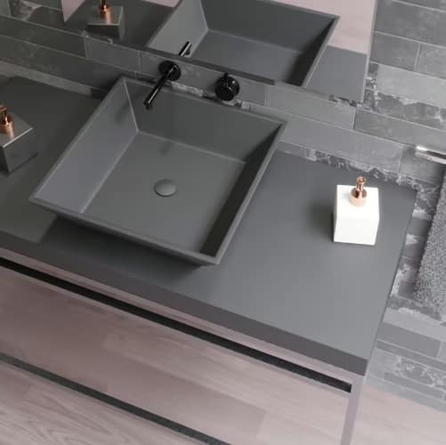 Aquí es donde Decoplat puede brillar: sus encimeras y lavabos en solid surface, resina o carga mineral son perfectos para crear superficies continuas, sin interrupciones. Cuando el lavabo fluye hacia la pared o la encimera parece surgir del suelo, la continuidad visual refuerza la sensación de amplitud y serenidad.